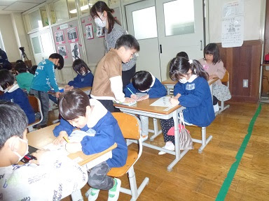 赤碕こども園とことうらこども園の年長組の子どもたちが、体験入学で赤碕小学校にきました。交流をするのは、1年生と5年生です。1年生は、年長さんに小学校生活について説明をしたり、一緒に遊んだり、勉強を教えたりしながら、温かく関わっていました。年長さんのプリントに赤鉛筆で花丸を描いている姿からも、小学校の先輩という頼もしさにあふれていました。5年生も、自分たちで計画を立て、相手に喜んでもらうためにどう関わっていくのか考えながら行動する姿に感心しました。どちらの学年も事前にしっかり準備をしていたからこそできたことです。みんなが笑顔いっぱいで楽しい時間でした。